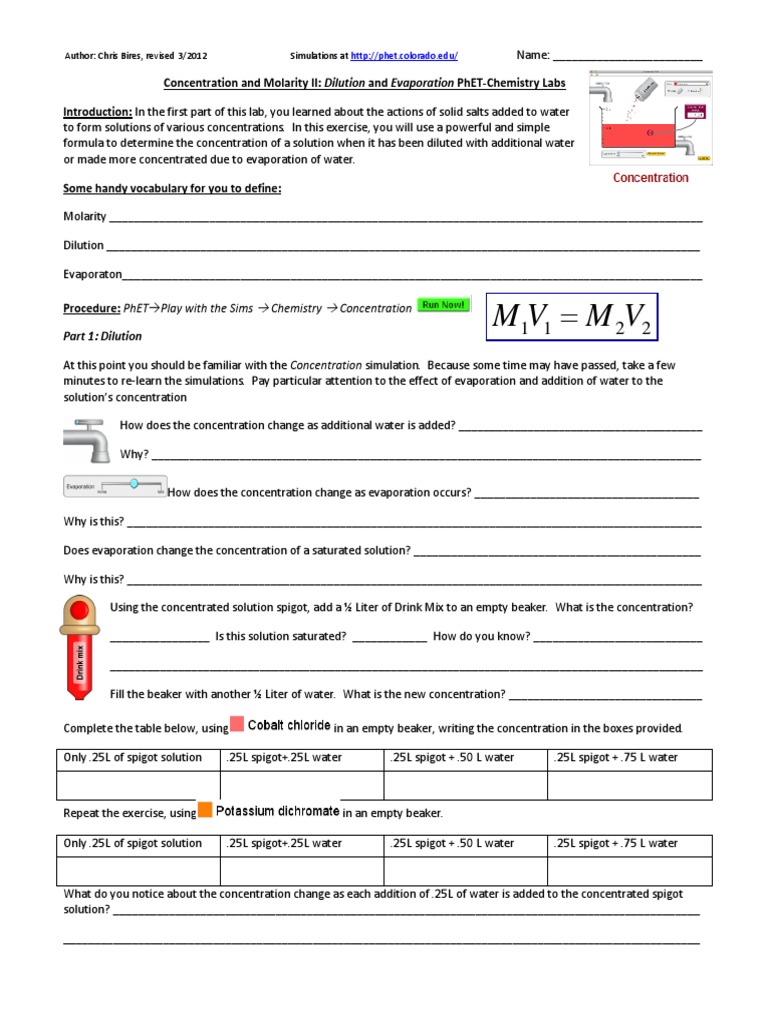 Preview of sample concentration and molarity phet lab answers. Concentration phet answer key pdf indeed. Identify when a solution is saturated and predict how concentration will change for any action or combination of actions where water or solute change. This is just one of the solutions for you to be successful. Biology physics chemistry earth science: Phet concentration simulation lab this is the link to the lab in case you need to access the site. With nextcloud you can phet do and do simulations in the cloud download you find, sync data among which devices. Physical science reflection and refraction lab name vocabulary normal incident ray reflected. Phet gas law simulation lab answer key. Rate free molarity phet lab worksheet answer key form. Concentration and molarity phet chemistry lab answers author: Concentration phet simulation lab answers. If you can't determine the concentration using the simulation molarity, try using the simulation concentration (you will use this information again in.